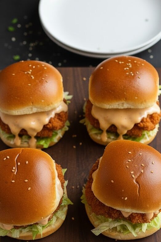 If you’re hosting a party, keep the fried chicken warm in the oven at a low temperature (around 200°F or 95°C) while guests arrive. Just before serving, toss the chicken in the sauce and assemble the sliders so they stay crisp and fresh.