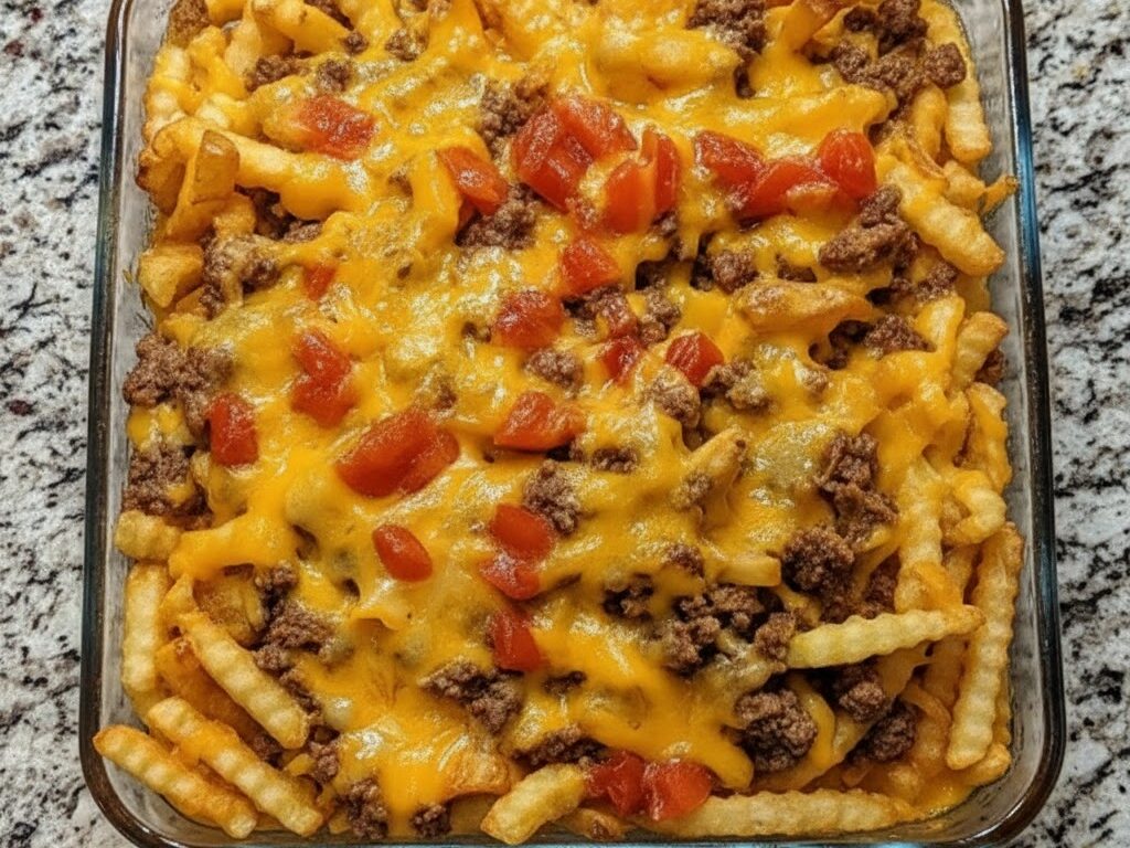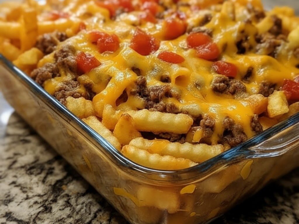 Imagine crispy golden fries layered with juicy, seasoned ground beef, melted cheddar cheese, and all your favorite burger toppings — baked to perfection in the oven. It’s hearty, indulgent, and surprisingly easy to make. Best of all, it’s a one-pan meal that takes less than an hour from start to finish.
