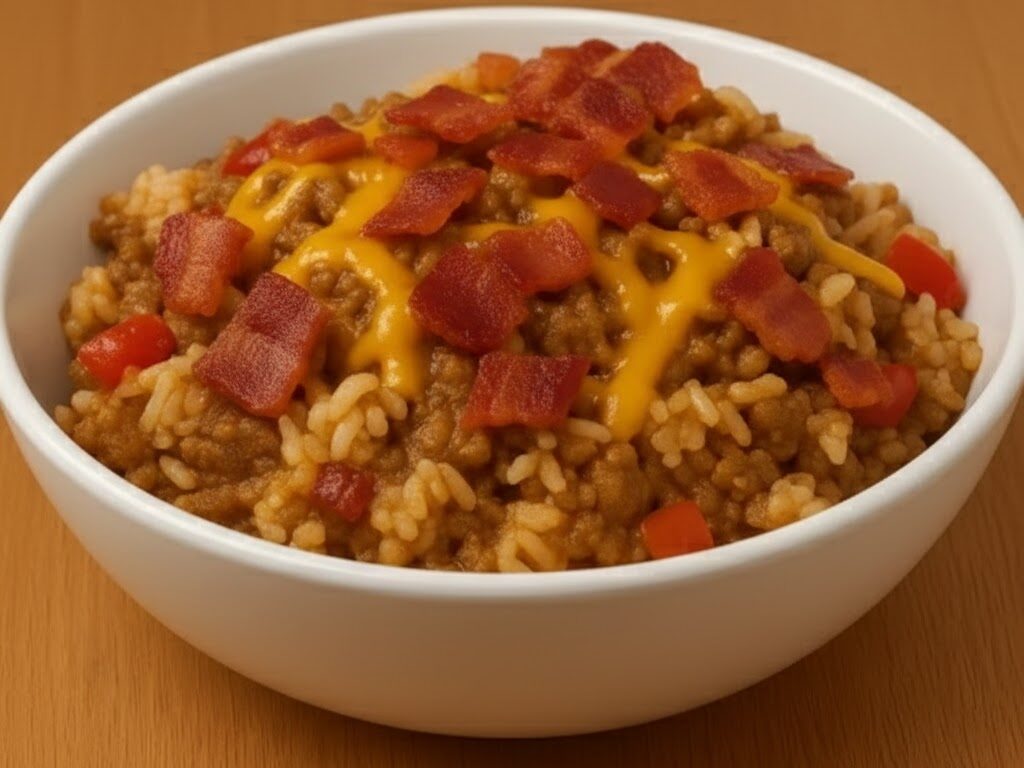 It’s a hearty, one-pan meal that brings together juicy ground beef, crispy bacon, and creamy cheddar cheese sauce, all mixed into perfectly seasoned rice. Each bite feels like comfort food heaven — rich, cheesy, and deeply satisfying. Best of all, it comes together in under an hour, making it perfect for busy weeknights when you want something home-cooked and crave-worthy.